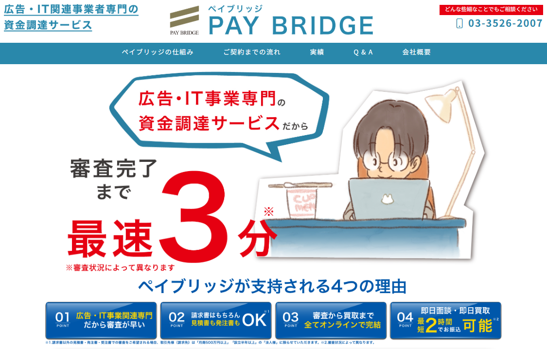 広告業界の経営者や個人事業主の資金繰りをサポートする「ペイブリッジ」は、カードローンや商工ローンとは異なる“融資ではない”資金調達サービスです。