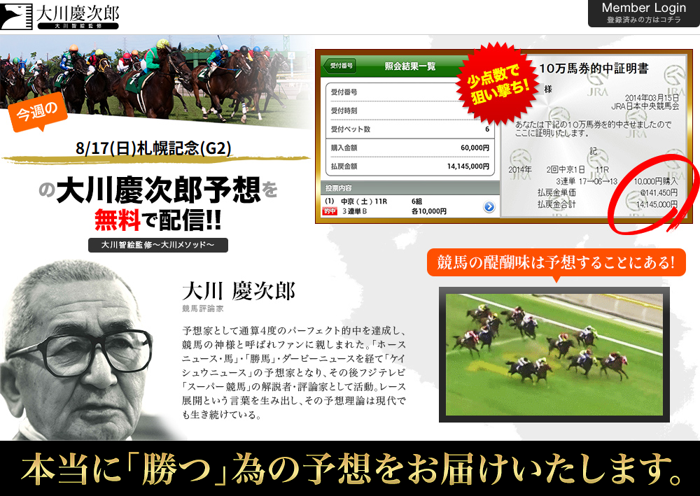 「大川慶次郎〜競馬の神様と女神のパーフェクト馬券メソッド〜」は、日本競馬界において伝説的存在とされる故・大川慶次郎氏の予想を正統に継承した競馬情報サイトです。