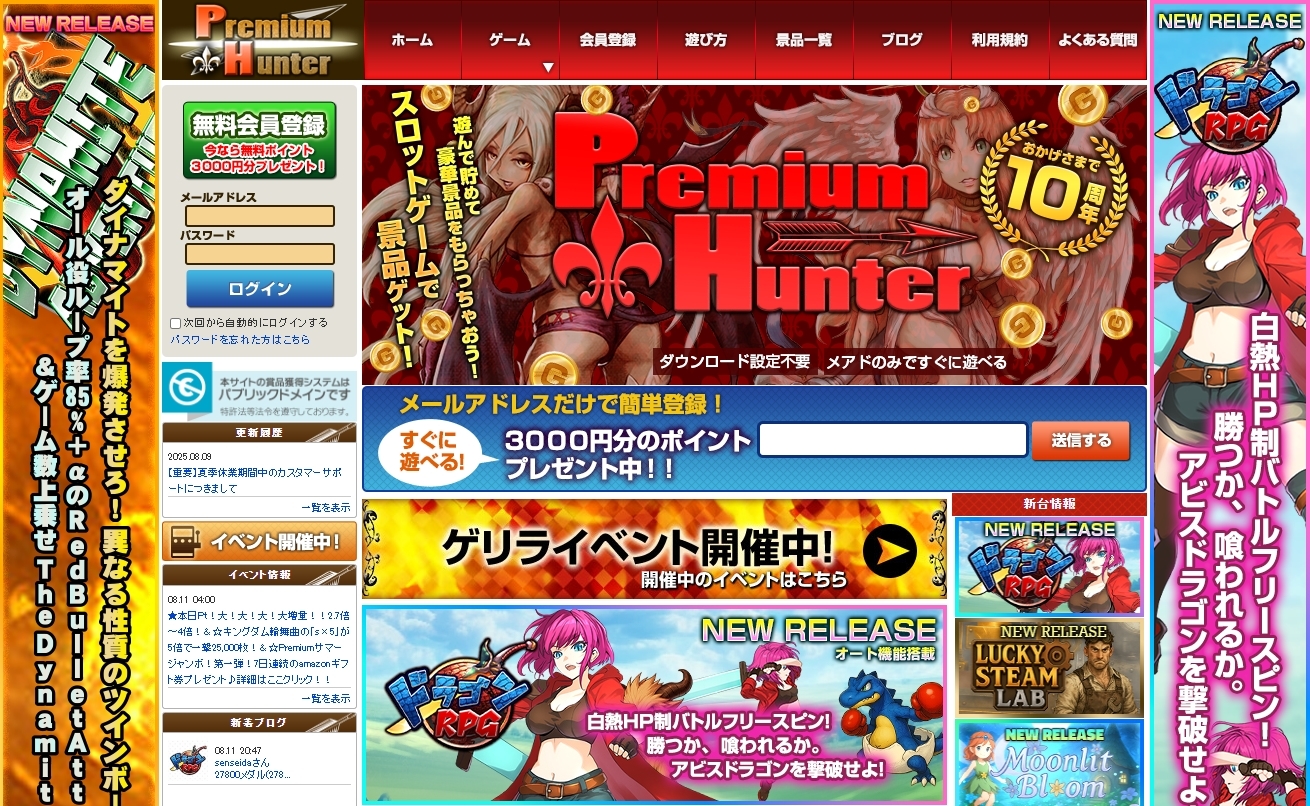 「プレミアムハンター」は、パソコン・スマホ・携帯に対応し、24時間いつでもどこでも楽しめるオンラインゲームサイトです。