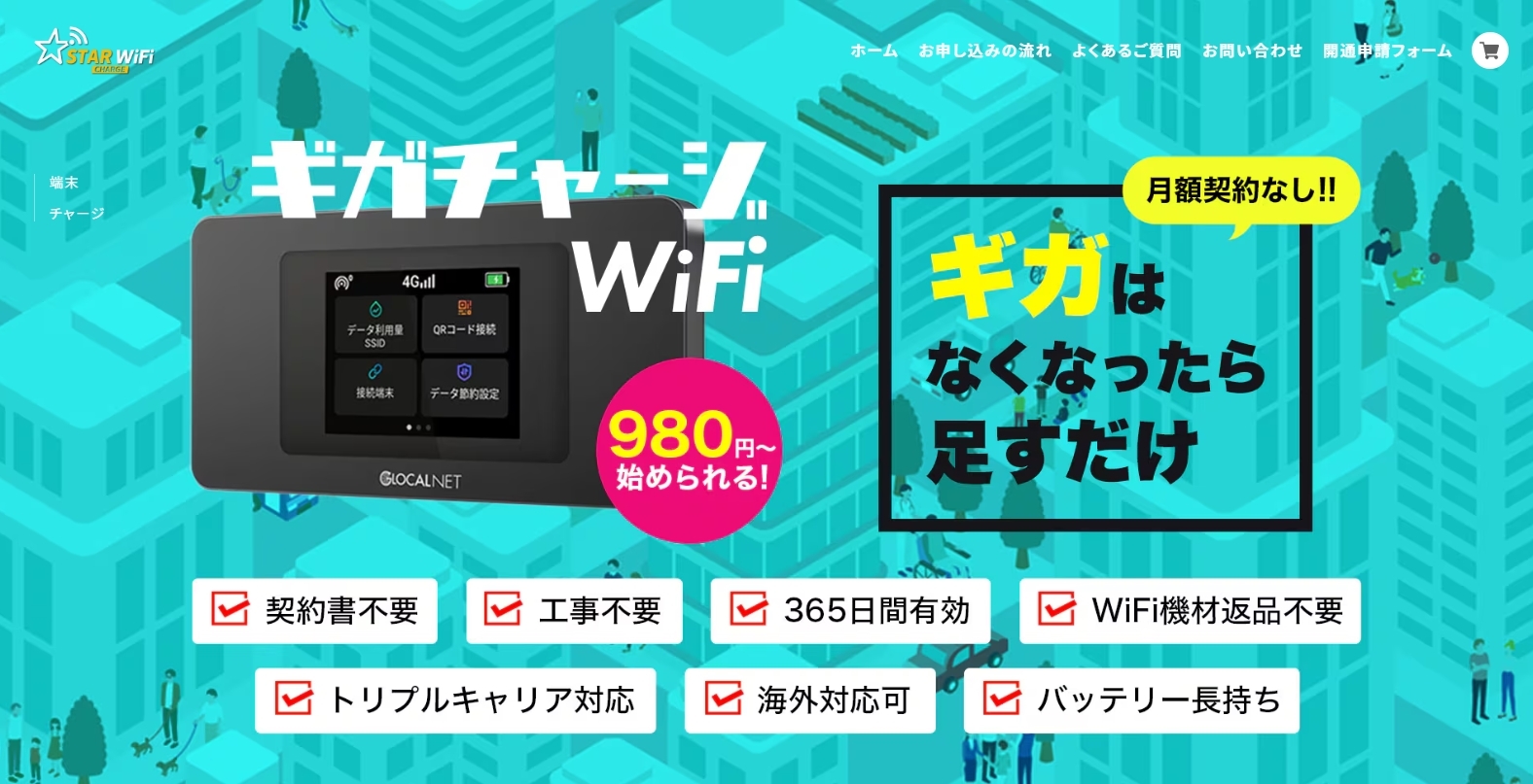 公式サイトはこちら STARチャージ Wi-Fi 「スターWi-Fiチャージ」は、初期費用・月額費用が一切不要のポータブルWi-Fi。 必要なGB数だけ専用アプリで即時チャージでき、残量や利用日数、充電残量、接続台数まで簡単に確認可能です。 4000mAhの大容量バッテリー搭載で、外出先や車中泊、キャンプなど長時間利用にも安心。 登録不要ですぐに使えるため、月ごとの利用量に差がある方や、臨時でWi-Fiが必要な方に最適です。ファミリーWi-Fi、アウトドアWi-Fiとしても活躍します。 商品名 STARチャージ Wi-Fi カテゴリ 家電・家具