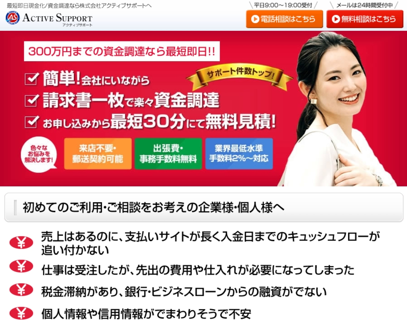 アクティブサポートのファクタリングは、法人様だけでなく個人事業主様もご利用いただける資金調達サービスです。