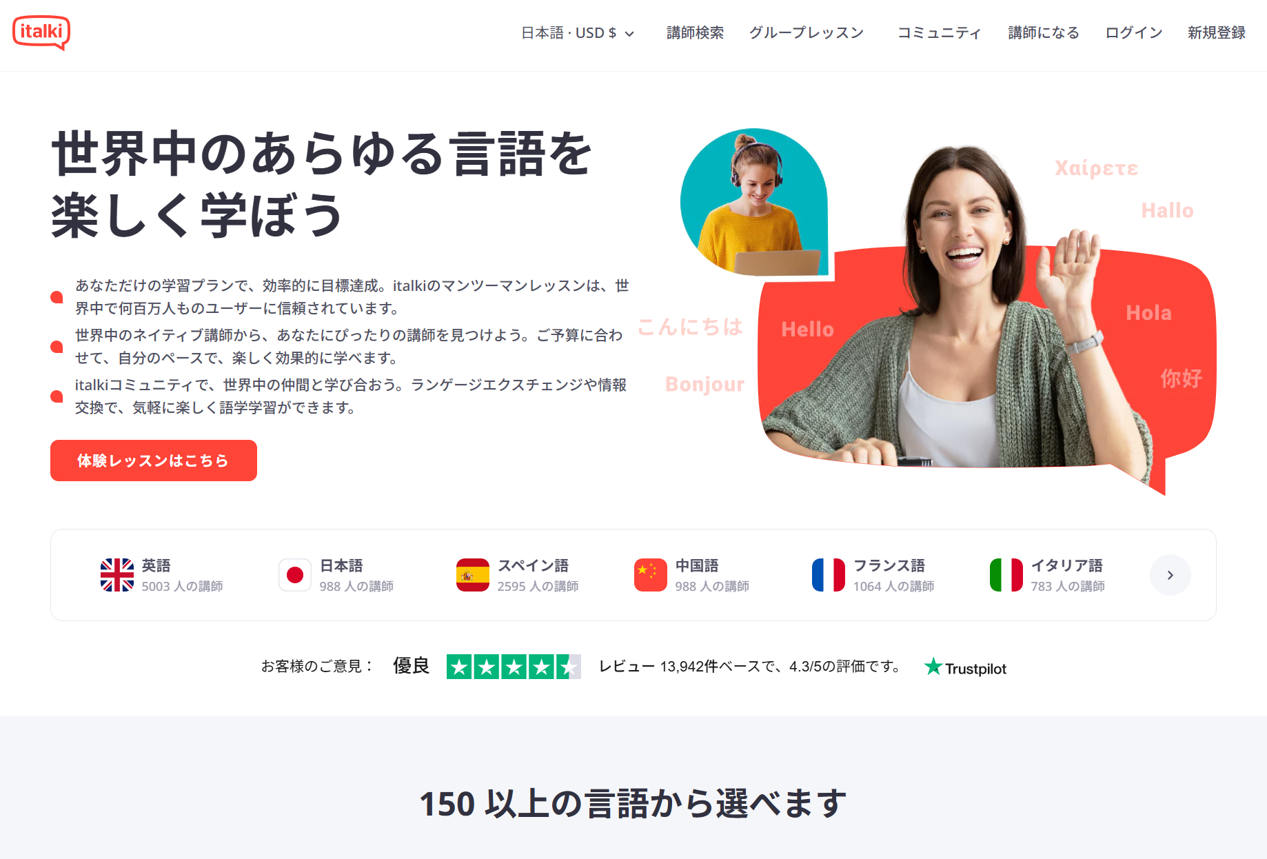 150以上の言語に対応し、世界中の30,000人以上の講師から自分に合った先生を選んで学べます。学習スタイルに合わせて、旅行会話・ビジネス英語・試験対策・お子様向けなど幅広いレッスンが用意されています。