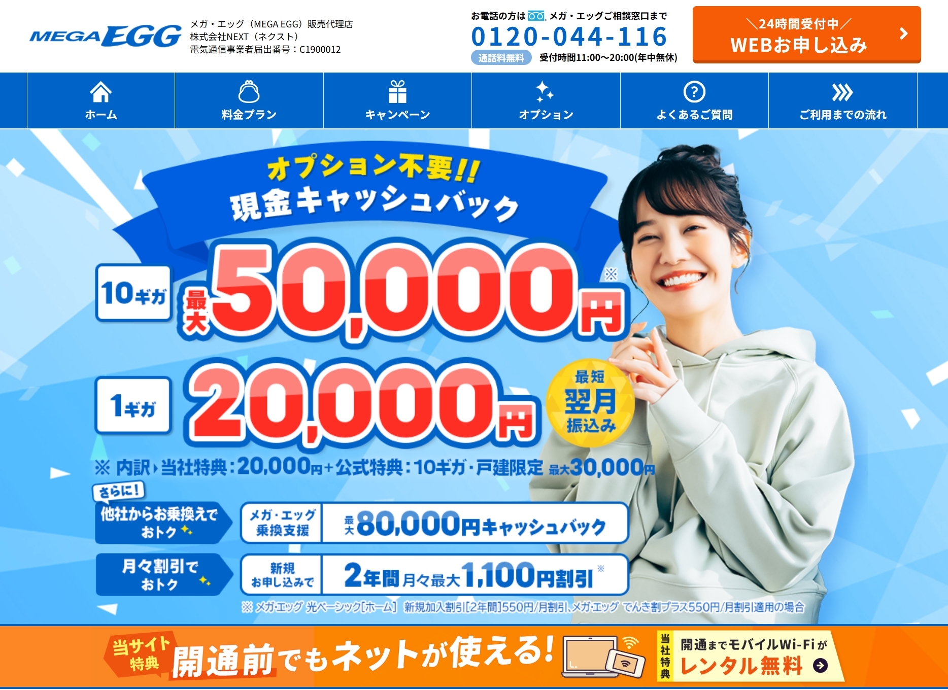 さらに正規代理店「株式会社NEXT」からのお申込みなら、オプション加入不要で最短翌月に 最大8万円をキャッシュバックが受け取れる特典付き。