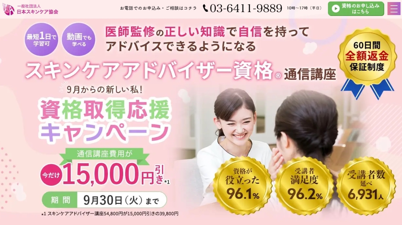 公式サイトはこちら スキンケアアドバイザー通信講座について 美容の専門知識を正しく、わかりやすく学べる「スキンケアアドバイザー資格」。 医師や大学教授監修のテキストは、図解が豊富で初心者でも理解しやすい構成です。通信講座だから自宅で自分のペースで学べ、最大2年間まで延長可能。 質疑応答や課題提出も無制限でサポート体制も万全。美容業界で活躍中のエステティシャンや美容部員、看護師の方はもちろん、スキルアップや転職を考える方にもおすすめです。 受講者の95.3%が満足した信頼の講座で、美容のプロとしての説得力とお客様からの信頼を手に入れませんか? 商品名 スキンケアアドバイザー通信講座 カテゴリ 教育