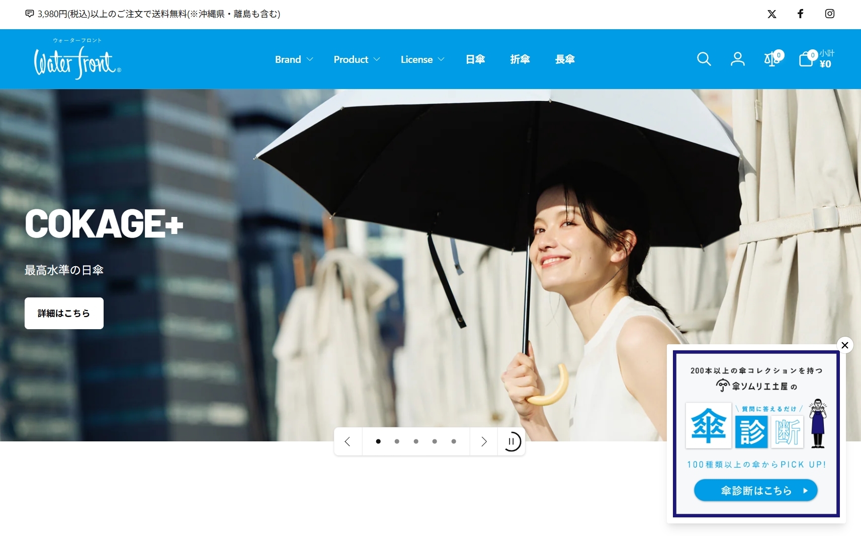 公式サイトはこちら Waterfront(ウォーターフロント)について 累計販売数2億本以上を誇る国内屈指の傘ブランド「Waterfront」。 話題となった東レ(株)のサマーシールド生地を使用した『最高水準の日傘 COKAGE+』は、楽天市場ランキング1位を獲得し完売するほどの人気商品。 他にもUVカット率99%以上の晴雨兼用傘など、美容や紫外線対策にこだわる方から支持されています。 毎月お得なセールやキャンペーンも実施中で、贈り物にも喜ばれるデザイン性と機能性を兼ね備えた傘を公式オンラインショップからお届けします。 商品名 Waterfront(ウォーターフロント) カテゴリ 家事・日用品