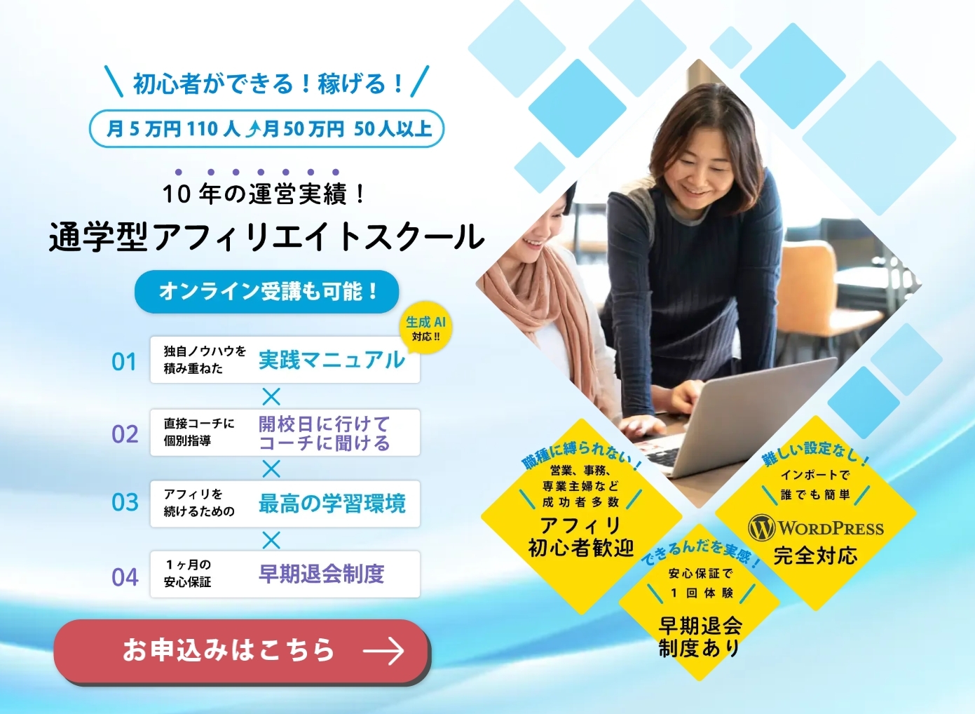 公式サイトはこちら atus 通学型アフィリエイトスクールについて 「atus(ええタス)」は、初心者からでも着実に成果を出せる通学型アフィリエイトスクールです。 東京・大阪・オンラインから自由に参加でき、現役アフィリエイターが個別サポート。記事の書き方やキーワード選定、分析ツールの使い方まで丁寧に指導します。 24時間利用可能なオンライン自習室や、仲間と交流できる環境も整備。 最低利用期間は12ヶ月ですが、初回サポート日の翌日までなら早期退会も可能なので安心。 月額16,500円(税込)で、収益化に必要な知識とスキルを体系的に学べます。 商品名 atus 通学型アフィリエイトスクール カテゴリ ビジネス