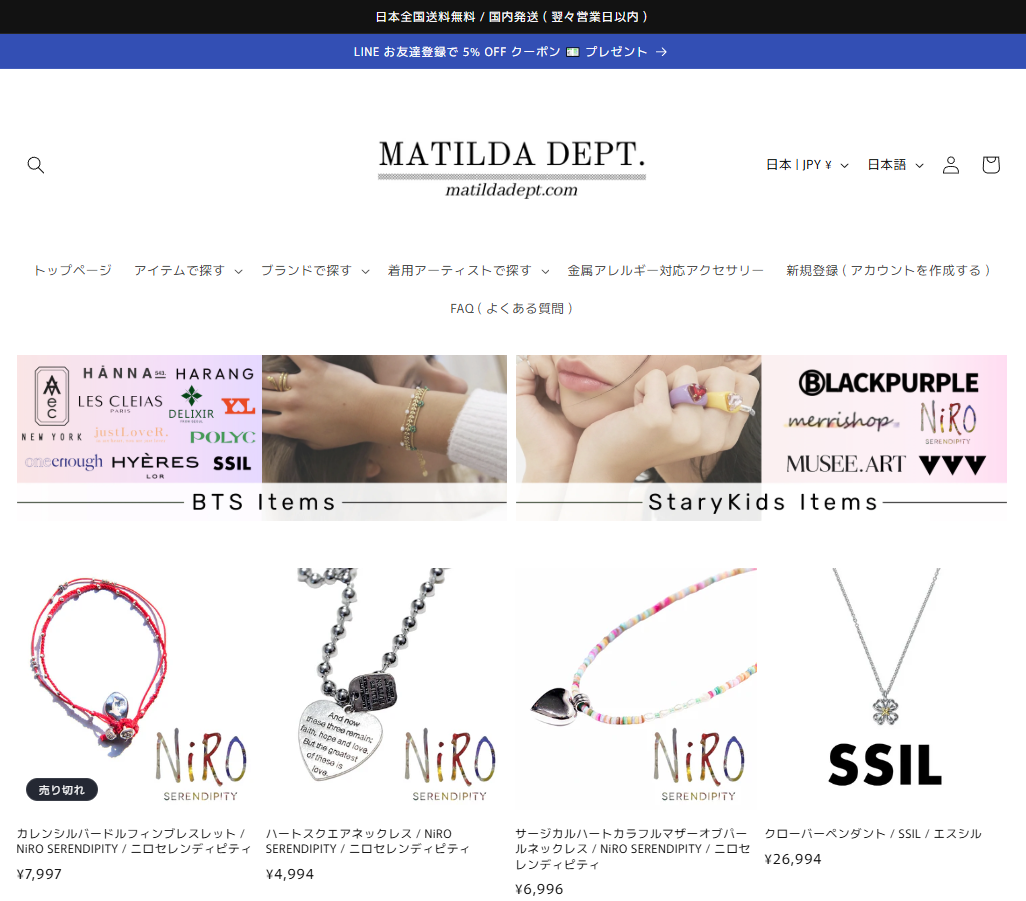 日本のオンラインストア【MATILDA DEPT.】では、人気K-POPアーティストも愛用しているアクセサリーやジュエリーを多数取り扱っています。韓国ブランドを中心に、パリ、ニューヨーク、オーストラリアなど、世界各国のインポートブランドが勢揃い!