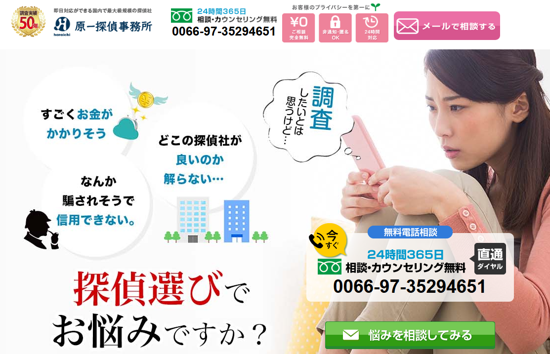 テレビやメディアでも多数紹介されている「原一探偵事務所」は、全国18拠点のネットワークと最新鋭の調査機材を駆使し、浮気・不倫調査、人探し、ストーカー対策、いじめ調査など、あらゆる問題に経験豊富な調査員が対応します。